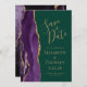 Det moderna bröllop spara datum-kortet från elegantens lämnat kant har en lila vattenfärgsagat gräns som trimmas med faux guld glitter. Anpassadet kombinerar handskrift, rityta och kursivt typsnitt med guld-färgad på en bakgrundsbild av grönten. Den omvända sidan har en matchande lila- och guld-agate-design.