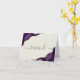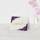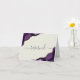 Den här eleganten har det moderna platskortet bröllop bord ett lila vattenfärgsagat med guld faux glitter i motstående hörn. "Reserverat" ord visas i handskriftsskript för grått med dekortecken före och efter på en elfenbensbakgrund på båda sidor av kortet.