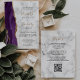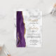 Den lämnat kant i eleganten i den moderna bröllopsinbjudan har en lila vattenfärgsagat gräns som trimmas med faux guld glitter. Anpassadet kombinerar handskrift av guld-färgad med svart tryckplåt och kursivt typsnitt på vit och grått-marmorbakgrund. På baksidan finns det utrymme för information om bröllop på en marmorbakgrund, tillsammans med en QR-kodgäst som kan söka efter webbplatsen och OSAN, vilket sparar kostnaderna för utskrift och utskick av separat OSA kort.