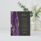 Den moderna bröllop-menyn på den lämnat kant i eleganten har en lila vattenfärgsagat gräns som trimmas med faux guld glitter. Anpassadet kombinerar handskriftsskript för guld-färgad och typsnitt för kopieringsskylt på en bakgrunds svarta bakgrund. Den omvända sidan har en matchande lila- och guld-agate-design.