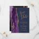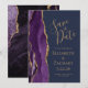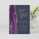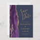 Det moderna bröllop spara datum-kortet från elegantens lämnat kant har en lila vattenfärgsagat gräns som trimmas med faux guld glitter. Anpassadet kombinerar handskrift, rityta och kursivt typsnitt med guld-färgad på en marin blå bakgrund. Den omvända sidan har en matchande lila- och guld-agate-design.