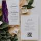 Den lämnat kant i eleganten i den moderna bröllopsinbjudan har en lila vattenfärgsagat gräns som trimmas med faux guld glitter. Anpassadet kombinerar grått-skriptet för kol och sans serif typsnitt på vit bakgrund. På baksidan finns utrymme för information om bröllop, tillsammans med en QR-kodgäst som kan söka på webbplatsen och OSAN, vilket sparar kostnaderna för utskrift och utskick av separat OSA kort.