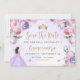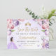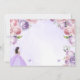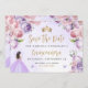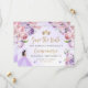 Den här vackra quinceañera Save the Date har en gräns av lilac lila och rosa blommor på en blek lila vattenfärgsbakgrund. Guld tiara, en mörk-ordförande i en lila prinsessa-klänning och små lila-fjärilar dekorerar texten. Orden "Spara datum" och "Quinceañera" visas i handskriftsskriptet elegant guld-färgad, med datum, ställe och gäst för hedersans namn i grått sans serif-teckensnitt. Blommigtens utformning upprepas på kortets baksida.