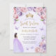 Detta vackra Sweet sixteen har en gräns av lilak lila och rosa ros på lila vattenfärgsbakgrund. En guld-tiara, en brunettflicka i en lila prinsessa-klänning och små lila-fjärilar dekorerar texten. Ord "Sweet sixteen" och namn i hederskammaren visas i handskriftsskriptet för guld-färgad i elegant, med den återstående texten i grått sans serif font.