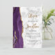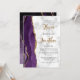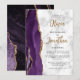 Den vänstra kanten på denna eleganta moderna bröllopsinbjudan har en lila akvarell-agat kant med falskt guldglitter. Den anpassningsbara texten kombinerar guldfärgad kalligrafiskrift och svarta sans serif-teckensnitt på en grå och vit marmorbakgrund. Baksidan har en matchande lila och guld-agat design.