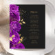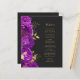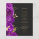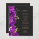 Den här elegantens moderna bröllop-meny har en gräns av lila blommor och guld faux foil löv. Anpassa guld-färgad kursiv text på mörkens svarta bakgrund. Baksidan av menyn är massiv skiffersvart.