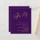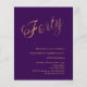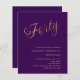 En modern inbjudan till snyggt för en 40-årsdag party. Lila färgad bakgrund och ord 40 skriven med elegant stort skript brev i faux guld. Anpassa och lägg till information om namn och party. 1 lakan = 1 inbjudan tryckt kant till kant.