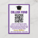 Det här moderna finansieringskortet för högskolorna i lila och guld anpassningsbar i studenten har en QR-kodlänk för gäster som kan bidra till att täcka utgifter för högskolan i student i universiteten. Anpassa med ditt meddelande, skolan namn och året.