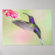 Skriv ut med den vackra, violetta sabrewing hummingbird som flyger genom en molnskog mot en rosa blomma. Den här bedövande flingfågeln är ganska stor, med djupa fjädrar från lilan och vita spetsar på de yttre fjädrarna från svan. Unik och vacker dekoration för hummingbird, trädgård och natur älskare. Fotografi från Bosque de Paz Reserva Biologica, Alajuela, Costa Rica.