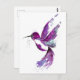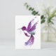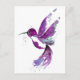 en dekorativ vattenfärgsgrafik av lite lila färgad hummingbird som sprider vingar och leviterar på ett vykort.