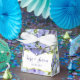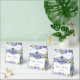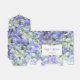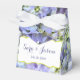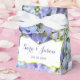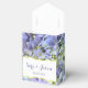 Den här bröllopsförmånslådan i tält med vitt band har ett foto av fullt bloom lila hydrangeas. En vit parentesformad ruta på framsidan under klaffen har anpassade för namnen på briden och trimmen och deras datum i bröllop.