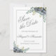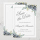 Designen har en bukett av lila hydrangeor med en bukett eukalyptusgrönska med en ljusgrå kant. Den passar med vår matchande samling av bröllopsinbjudningar.