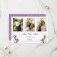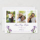 Förvänta dig ett elegant trädgårdsbröllop med den här känsliga blommigten spara datumet. Två iris-blommor blåser i kortets grund hörn och ger mjuk lila. Du kan anpassa tre foton i lodrät ovan. Baksidan har en solid lavender färg med ett minimalistiskt, modernt motiv. En perfekt för ett vår bröllop.