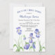 En underbar vattenfärg inbjudningskort för möhippan med vår blommor, lila iris, på vit bakgrund.