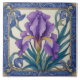 En lila iris-blomma med gult-accenter, omgiven av grönt löv och en blå blommigt gräns, art nouveau stil, tungrodda detaljer, vibrant färg, elegant design.