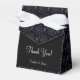 Täckt i fractalblommor i blanka kandiser färg av lila, grönt, lavender och blått på svart bakgrund. På framsidan finns "Tack!" och fält för namnen eller textvalet i ett söt vitt teckensnitt över en svart bakgrund. Konstverk och design av Karlajkitty