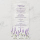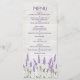 Rackkort för bröllop Menu med lila lavender-blommor på ljusa träplankbakgrunder.