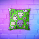 Gröntens bakgrund med söta lila Kawaii-tecken och lavender-blommor på detta dekorativ kudde.