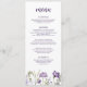 Den här bröllop-menyn har vackra lila- och lavender-blommor på grund, parade med grönt för en utomhusträdgård eller ett utseende från fält bröllop.