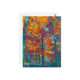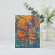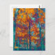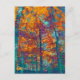 En målad bild av träd under hösten, i fet färg av gult, lila, orange och teal.