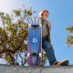 Skateboard, gjord i lila med en triangel med blå strålar. Anpassa för att lägga till egen text.