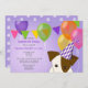Den här söta flickans hund-temade födelsedagsfest inbjudan har en ädel Jack Russell Terrier som tittar över grund kant på inbjudningskortet med en färgstark lila, grått och vit vågigt strimlad födelsedagsfest-hatt med en multifärgad - rosa, kalk, gult, orange och lila-flagga-buntning hänger i bakgrunden och matchande multifärgad-ballonger med vitt rosett band flyter om ett blekens lila baksida - baksidan av kortet är blek lila med liten tass avtryck i vitt - anpassa med ditt barns mönster - party Russell Terrier med huvudlutning © katz_d_zynes 2019