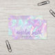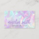 affärskort för trendig som innehåller ditt namn i ett lila skript på en tryckt bakgrund som påminner om tryckt plastfilm i blek pastel holoGraph färg och kontaktinformation på baksidan.