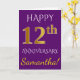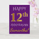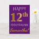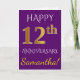 Denna enkla, personliga gratulationskortdesign för bröllopsdag har budskapet "GRATTIS 12 ÅRS DAG", med "12:e" i en falsk guldliknande färg. Framsidan har också ett anpassat namn och en lila bakgrundsfärg. Insidan har ett anpassningsbart gratulationsmeddelande för bröllopsdag. Det kan ges till en man eller en hustru för att fira parets tolfte bröllopsdag.
