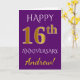 Denna enkla, personliga gratulationskortdesign för bröllopsdag har budskapet "GRATTIS 16-ÅRSDAG", med "16:e" i en falsk guldliknande färg. Framsidan har också ett personligt namn och en lila bakgrundsfärg. Insidan har ett anpassat gratulationsmeddelande för bröllopsdagen. Det kan ges till en make eller maka för att fira parets sextonårsdag.