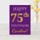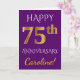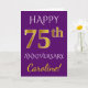 Denna enkla, personliga gratulationskortdesign för bröllopsjubileum har budskapet "GRATTIS PÅ 75-ÅRSJUBILEUM", där "75" har ett falskt guldliknande utseende. Framsidan har också ett anpassat namn och en lila bakgrundsfärg. Insidan har ett anpassningsbart gratulationsmeddelande för bröllopsjubileum. Det kan ges till en make eller en maka för att fira parets sjuttiofemårsjubileum. [~Z0000089]