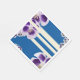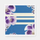 Lila, blå och vita blommor på marin blå bakgrund med vitt linjer.