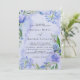 Designen har en tryckt färg med blomsterelement i nyanser av lila och dammig blå över gröna blad grenkrans och påsklilja tulpan hyacinter blommor på en ljus lila ljusblå akvarellbakgrund.. Perfekt för din bröllopsfirande!