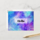 Ett vykort med kosmisk abstrakt som bakgrund. Viktig färg av ljusblå, rosa och lila. Vita stjärnor spridda runt..