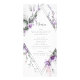 Fintvätt av lila och rosa vattenfärgsblommor med mörk grönt och lila löv och stam omger en dubbla med diamantformad ram som innehåller dina menyuppgifter. Kortets baksida är lila. Textmallarna är enkla att anpassa med hjälp av en ordlistetext och ett modernt teckensnitt.