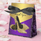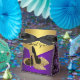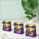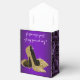 Lila och gul högklackad sko födelsedagspresentlåda med vackra gyllene högklackade skor och område på insidan och utsidan klaffen för text.