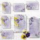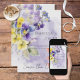 Den här enkla men eleganten sparar datumkortsdesignen med en bukett av lila, gult, laveringspansier och andra blommor med grön bakgrund. Bakgrunden är en lila vattenfärg stänk på en texturerad papper bakgrund med vit vattenfärg. Det är en del av Lila & Gult Blommigt Modern Bröllop Suite skapat av enbart Farmhouse Press.