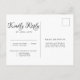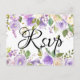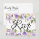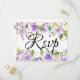 Lila och elfenbensvita blommor är placerade i gröna blad och vinrankor. Ett vackert och stort skrivsrift anger Rsvp på framsidan av detta svarsbrevkort. Baksidan av vykortet innehåller svarsdatum, svarsalternativ och måltidsval. Du lägger också till din adress så att det blir supersmidigt.