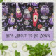 Denna lila och röda design har flera halloween-cocktailpotioner med fladdermus, spindlar, döskallar med mera. Se hela matchningssamlingen. Texten lyder "Sips To Go Down", men du kan redigera den med din egen text. Alla teckningar är hand plockade och Kaitlyn Thomas upphovsrätt.