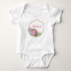 Den här fina barnklänningen för en babyflicka har en dubbel guldtrådram med en blomsterbukett av lila, rosa och röda blommor målade i akvarell. Inuti ramen kan du anpassa med din babyflickas namn.