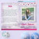 Ett begravningsprogram för lila och rosa daisy som är avsett för en ung eller tonåring flicka. Med hjälp av mallen kan du fylla i namn, födelsedatum, dödsdatum, födelsedatum/hyllning och serviceordning och uppdatera dina favoritfotominnen. Designad på ett standardvärde på 8,5 x 11 tum lakan av pappert redo som ska vikas i halvstorlek. Bakgrundsdesign är lila moln och daisy gräns.