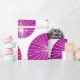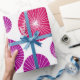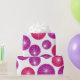 Detta papper har en modern utformning av lila- och rosa-cirklar i mitten av århundradet med vita stjärnor i dem, alla på en vit fält.