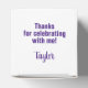 KLASSIFICERING i fetstil lila radbryter runt framsidan av dessa vita 2-tums fyrkantiga studentfester med ditt namn och tack för ditt meddelande längst upp. Fyll med behandlingar som ett tack till gästerna vid din studentfest. MATCHING-objekt och mer färg i vår samling.