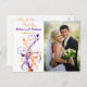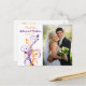 Det här vita, orange och lila-blommigten tack vare bröllop-fotopostkortet har ett mallområde där du kan ladda upp digitalfotot till. Den matchar bröllopsinbjudan som visas nedan. Om du vill ha några andra matchande objekt i den här designen skickar du e-post till niteowlstudio@gmail.com.