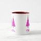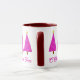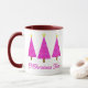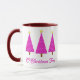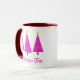 Mugg i ett modernt grepp om det klassiska Julgran-motivet - tre träd i orkidé och lavender paisley, med vit accent, på magenta med djup ametyst lila, med texten " O Jul