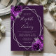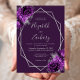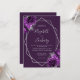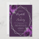 Den här elegantens moderna bröllopsinbjudan innehåller en silver-geometrisk ram som dekoreras med plum- och silver-blommigtar på en djup lila bakgrund. Anpassadet kombinerar silver grått med fysisk handskrift, tryckplåt och kursivt typsnitt. Baksidan är solid lila.