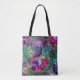 Denna djärva utformning visar en lila fredsbock med en krona i guld som omges av rosa och lila blommor mot bakgrund av lila, teal och blått med guld blommigt inslag.
