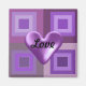 En roligt med ett lila puffigt hjärta med en bakgrund av fyrkanter i skuggor av lila. Man kan ändra ord ?kärlek? efter behov.