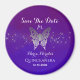 Modern, elegant, unik, glitter faux silver-fjäril i kombination med den vackra lila royalets blå bakgrund. Chic, visuell, tidlös Quinceanera sparar datuminbjudningskortet.