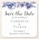 En elegant blommigt ram av vattenfärgen lila ro ram i chicen vinterbröllop Spara datumet underlägg med ett vackert botaniskt gräns av violetta blommor och löv.