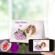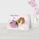 Detta underbara spanska Cavalier Kung Charles-kort är perfekt för Mors dag. Sadie, en vacker Cavalier, vilar bredvid en bukett av lavender ro. Blomarna ger lite elegans och glädje.